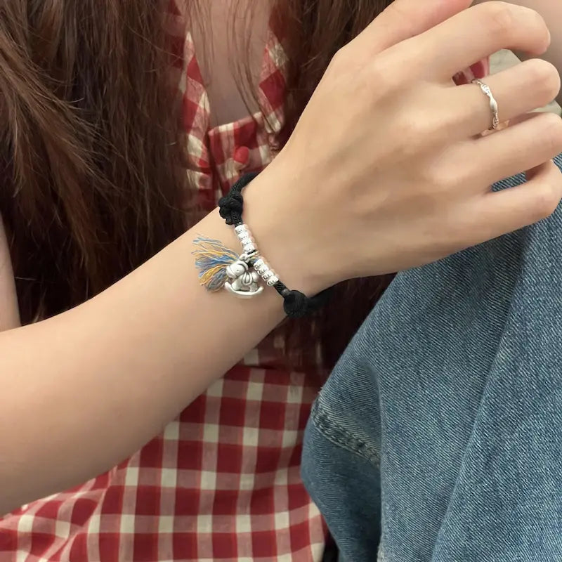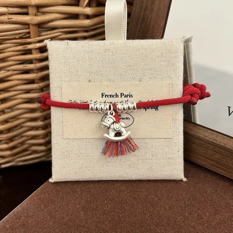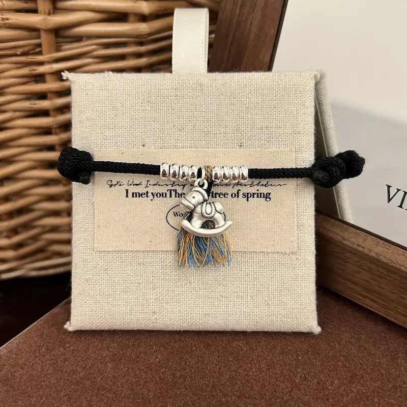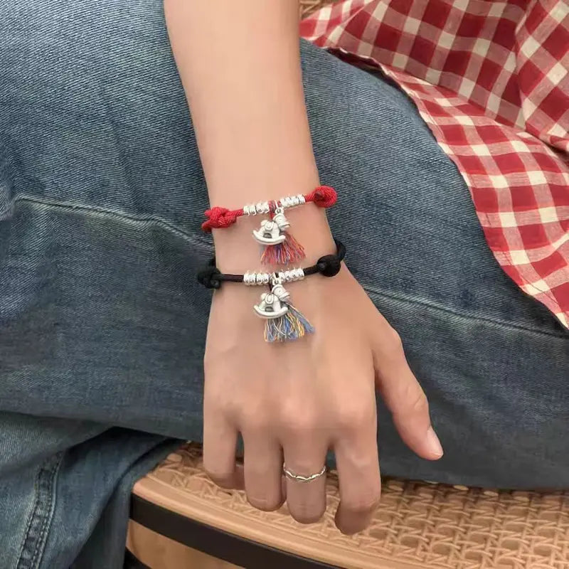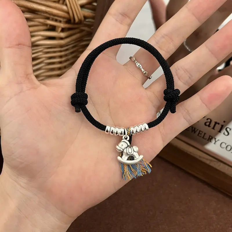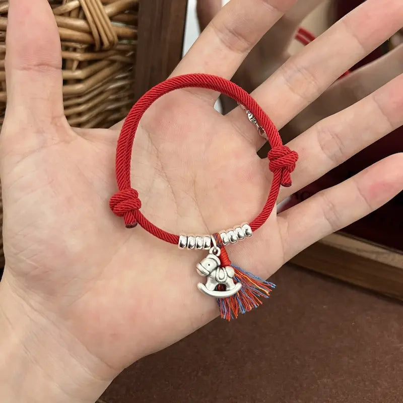 Designed exclusively for the 2026 Year of the Horse birth year, this bracelet features a red/black woven string base, paired with a sterling silver “Horse Brings Wealth” pendant (horse + copper coin shape) and coiled silver beads, implying “immediate success and abundant wealth”. The red string fits the traditional birth year need for auspiciousness and evil warding, while the black string is low-key and versatile, ideal for daily couple wear. Colorful tassels add vibrancy, and coiled silver beads symbolize “rolling wealth”, making it a dual carrier of Year of the Horse blessings and couple tacit understanding.